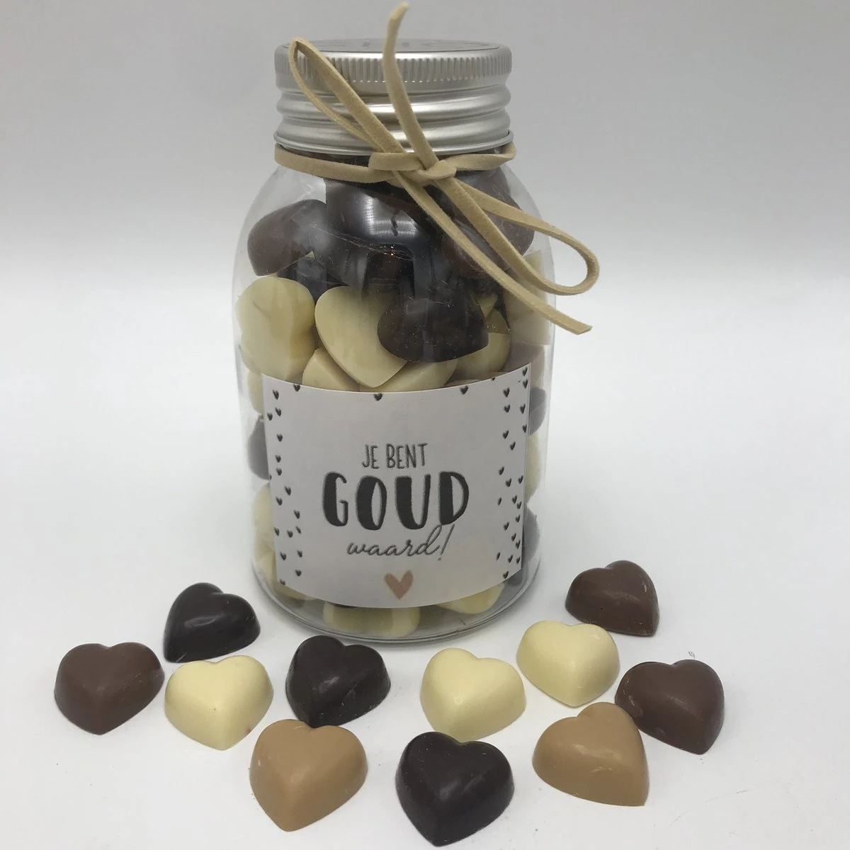 Een mooi chocoladecadeautje speciaal voor degene die goud waard is. Een flesje met de opdruk “je bent goud waard”, gevuld met 185 gram chocolade hartjes. De hartjes worden met zorg door ons gemaakt van topkwaliteit chocolade in de smaken melk, wit, puur en karamel. Het flesje heeft een metalen schroefdop en is gestrikt met suede koord. We verpakken het in een luxueus tasje met mooi dik goudkoord. Daarop bevestigen we de kaart “jij bent goud waard” met een houten knijper in hartvorm.