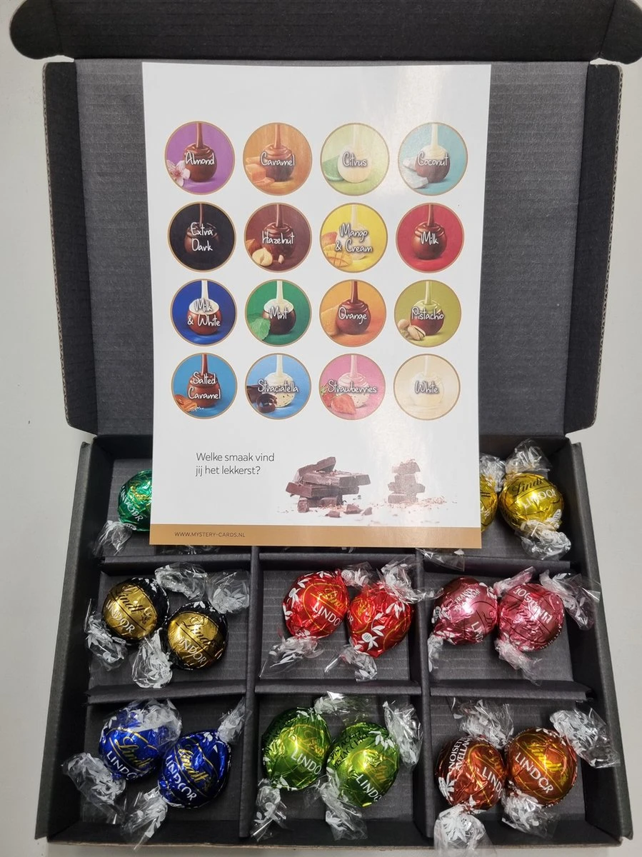 Proeverij van 9 verschillende chocolade smaken van Lindt kwaliteitschocolade in 1 box door de brievenbus.