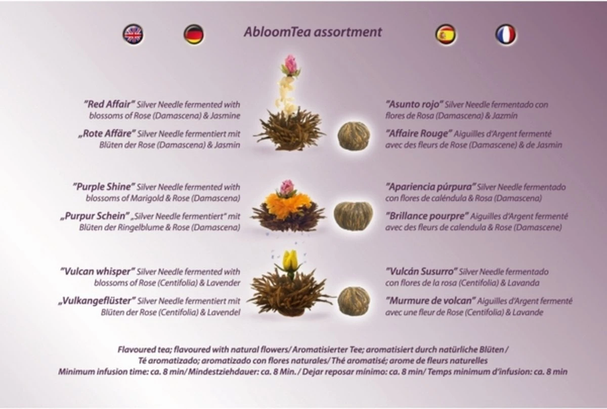 | Ingrediënten | Witte thee (minstens 95%), bloemen (1-5%) van pioenroos, goudsbloem, roos (Damascena), jasmijn, roos (Centifolia) Zwarte thee (minstens 95%); Bloemen (1-5%) van goudsbloem, roos (Damascena & Centifolia), jasmijn, lavendel |