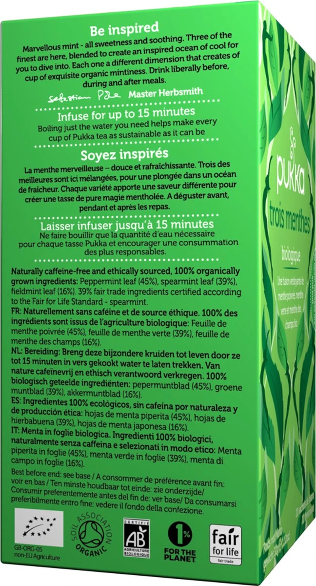Pukka Three Mint is een blend met pepermunt, groene munt en veldmunt. Gemaakt van 100% biologische ingrediënten die duurzaam verbouwd zijn. Breng deze heerlijke kruiden tot leven door ze tot 15 minuten in vers gekookt water te laten trekken. Een doosje bevat 20 individueel verpakte theezakjes die volledig biologisch afbreekbaar zijn.
