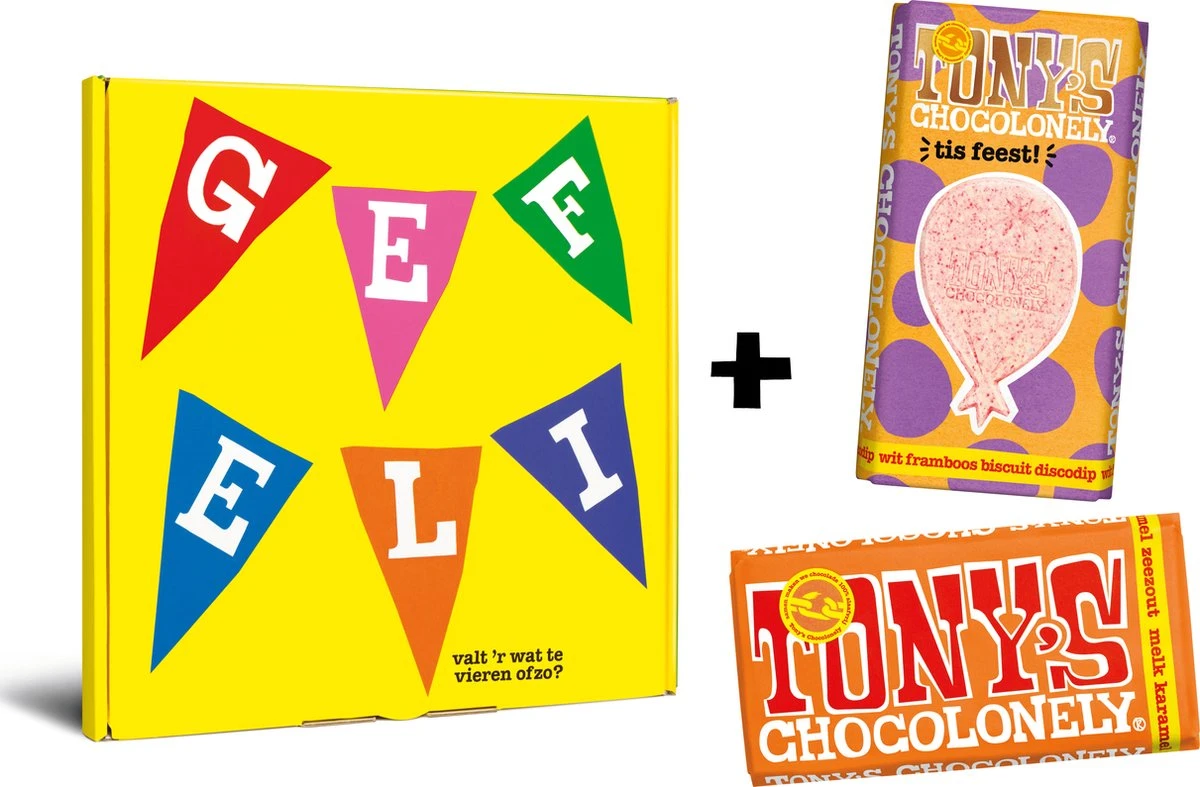 Tony’s Chocolonely Geschenkdoos Verjaardag – Gefeliciteerd T is feest! – Chocolade Cadeau met 2 repen